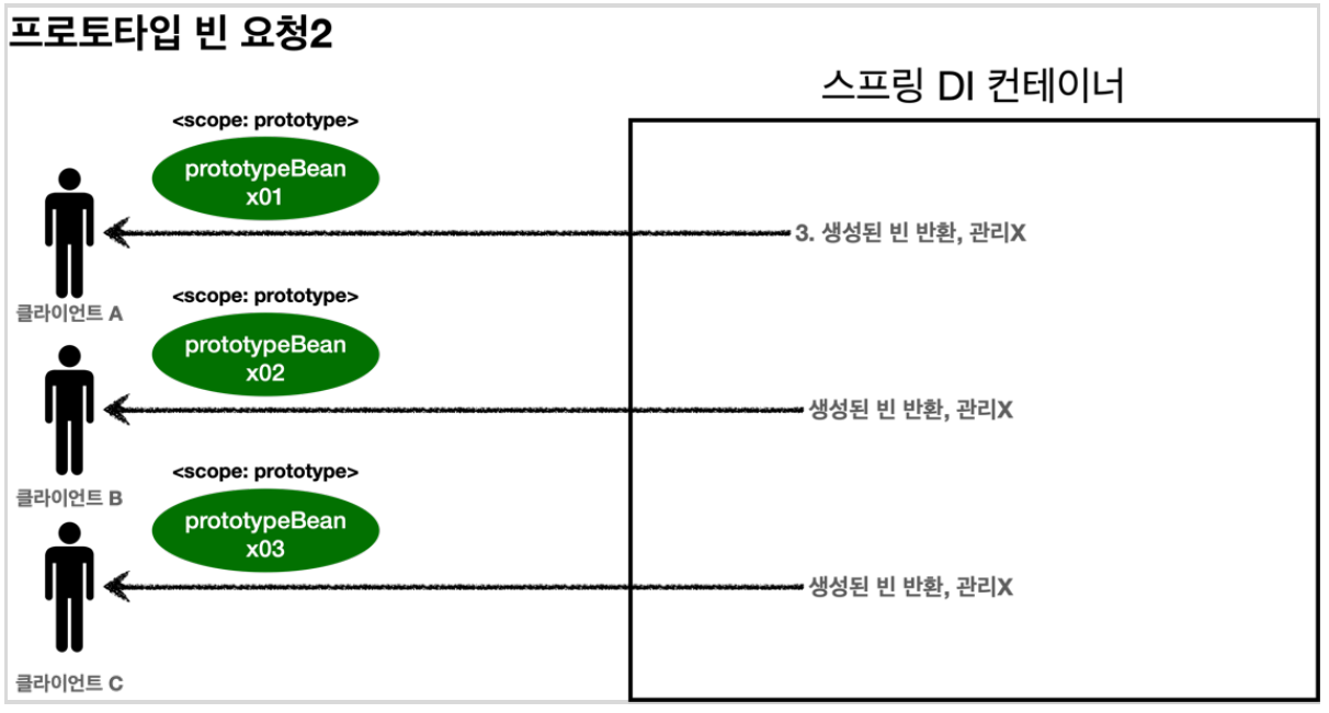 것이다. 클라이언트에 빈을 반환하고 스프링 컨테이너는 생성된 프로토타입 빈을 관리하지 않는다.