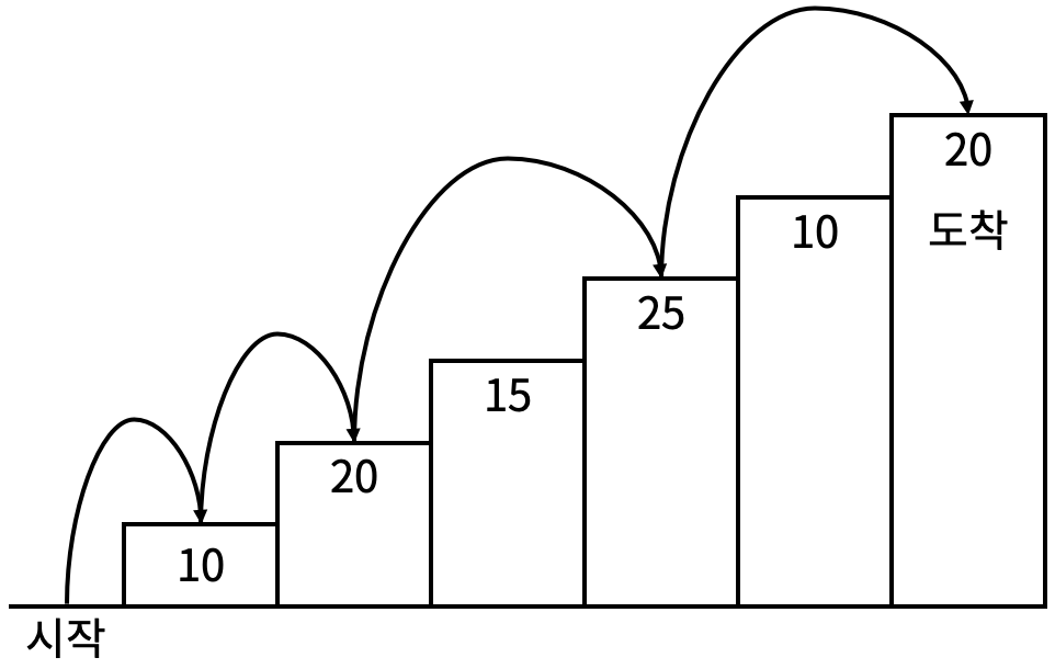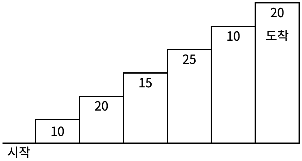 예를 들어 <그림 2>와 같이 시작점에서부터 첫 번째, 두 번째, 네 번째, 여섯 번째 계단을 밟아 도착점에 도달하면 총 점수는 10 + 20 + 25 + 20 = 75점이 된다.